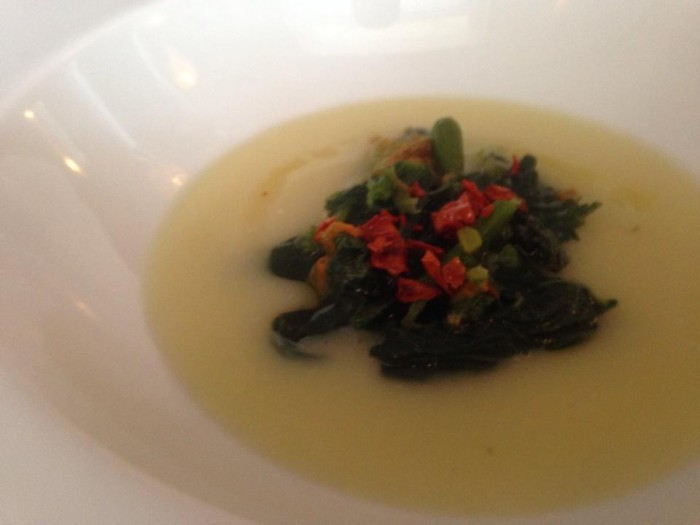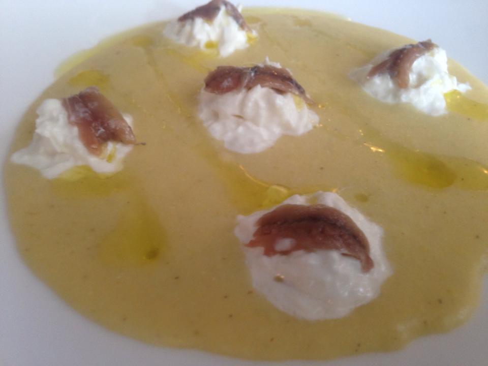 Come questa zuppetta iniziale in cui la consistenza della polenta è cremosa quasi liquida. Qui dove poi si pescano il latticino e tutto il resto.