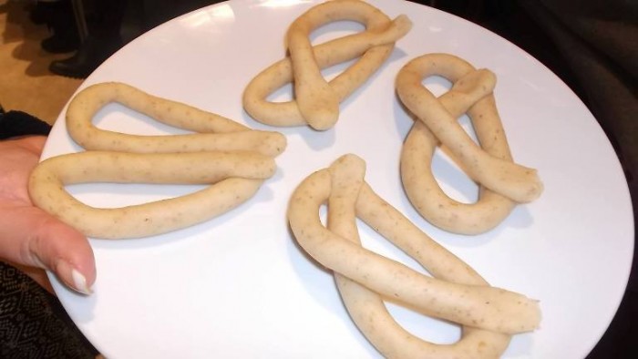 Alla fine ha tagliato tante striscioline da plasmare sapientemente in variegate forme. In modo particolare a guisa di Alfa ed Omega, perché queste due lettere dell’alfabeto greco rappresentano il principio e la fine di un ciclo naturale (come il periodo delle festività natalizie, in cui gli scauratielli sono prodotti e consumati maggiormente nel Cilento) e poi la credenza popolate dice che portano anche fortuna. Naturalmente i foodies presenti hanno potuto godere di questo prelibato e delizioso dolce, che in tutto il Cilento conta molte varianti.