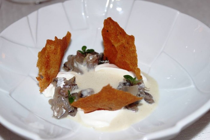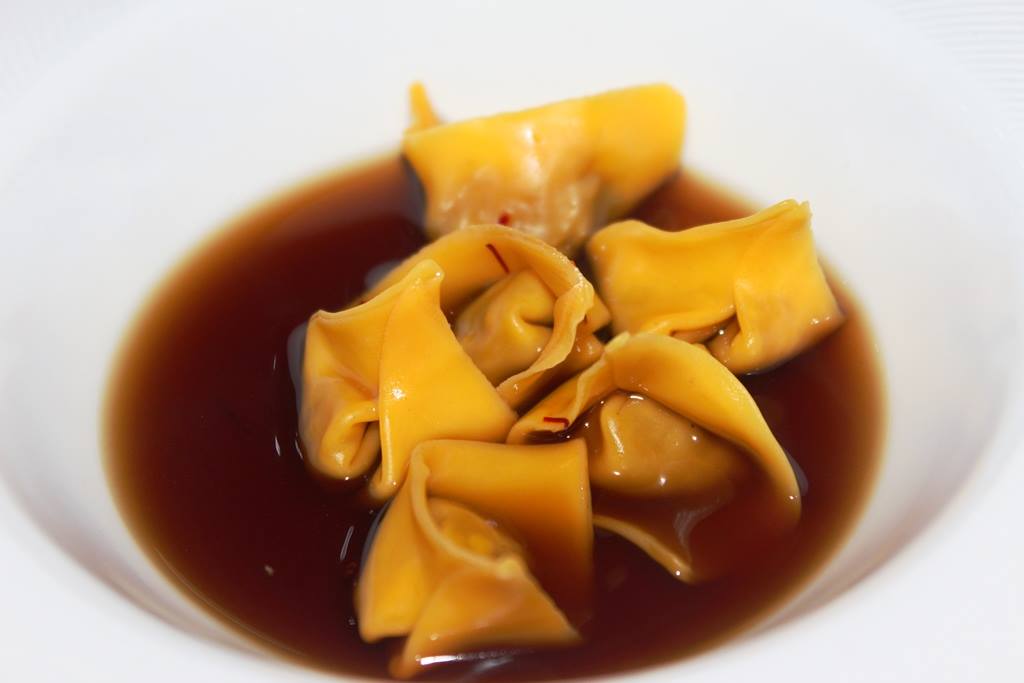 Osteria Arbustico, raviolini di cipolla caramellata in brodo di bucce di patate bruciate e infusione di porcini secchi