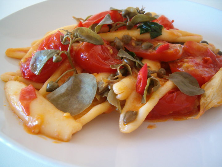 Cavatelli freschi con pomodorini e capperi con le proprie foglie: lectio sulla puttanesca