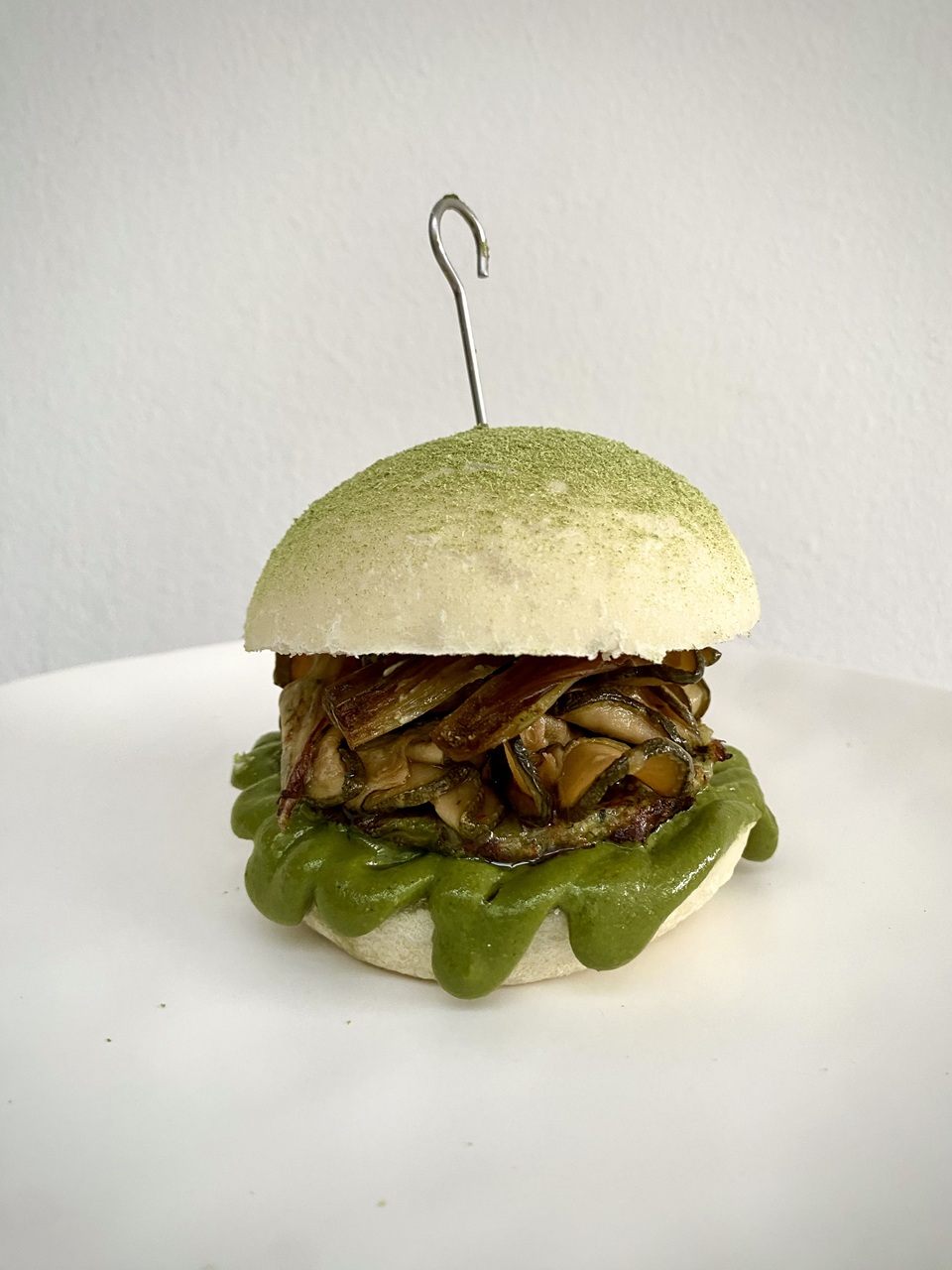 Questa ricetta nasce dall’idea di Chiara secondo cui la cucina vegetale non è un compromesso, ma una scelta piena e consapevole. Il verde nel suo panino è il filo conduttore tra estetica, sostanza e sostenibilità. Partendo da un bun al vapore e da un pesto di tenerumi e basilico, si passa alle zucchine, protagoniste in doppia veste, nella loro forma originale e come rösti croccante, dorato e sapido per arrivare ad un cipollotto cotto a bassa temperatura, una salsa di ricotta “scante” e menta e per terminare un gel di limone semi-candito e pinoli tostati.