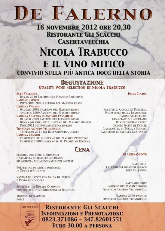 Nicola Trabucco va subito sul concreto, sui confini dell’Ager Falernus romano e di quanto fossero non coincidenti con la antica zona di produzione vinicola, assai più estesa e varia tutt’intorno al Monte Massico. Da molti anni egli studia il territorio, percorrendolo meticolosamente, alla ricerca di tracce della agricoltura romana, come un Indiana Jones di storia agricola