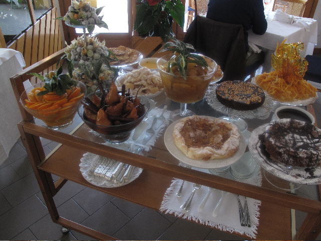 Ho lasciato spazio per un piccolo assaggio dal carrello dei dessert , dove si puo’ trovare di tutto e di piu’, dallo zabaione al cioccolato declinato in vari modi ,a torte alla frutta ,ai limoni e zenzero candito, alle pere cotte nel vino. Tutto sempre freschissimo, sempre di giornata e di ottima qualità.