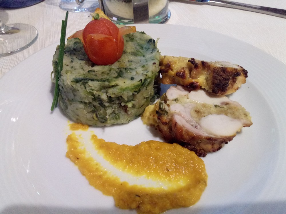 coniglio ripieno su crema di carote e cipolle ed accompagnato da un tortino di scarole e patate;