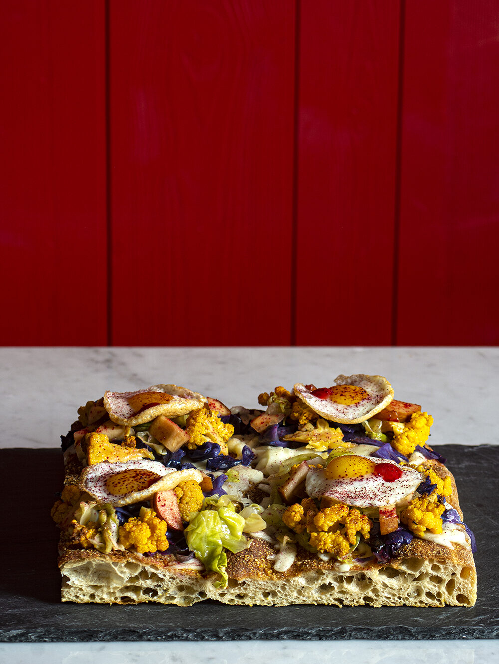 Tagliare un trancio di pizza dalle dimensioni di 20 x 20 cm. Aggiungere il fiordilatte, il cavolo cappuccio e il cavolfiore. Passare in forno a 230 °C per 3 minuti e successivamente guarnire con la mela fermentata tagliata a cubetti, le uova di quaglia, la crema di pomodoro fermentata e i limoni di Sicilia fermentati. Ultimare con una leggere velatura di polvere di barbabietola rossa.