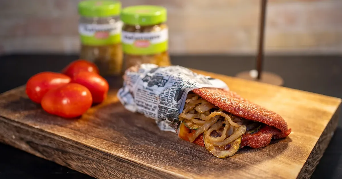 Farcire il Bao Buns con crema di pomodoro, filetti di peperone arrostiti, zucchine alla scapece e melanzane a filetti (precedentemente condite con la salsa ponzu). Servire.