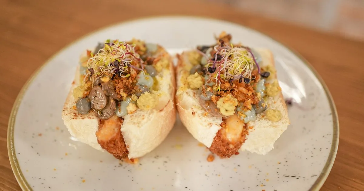 In questa preparazione, sono presenti tutte le caratteristiche che deve avere un panino, secondo Francesco: la dolcezza e la cremosità, date dalle patate dolci, avvolte nel crunch del pane panko; note di umami e acidità, conferite dalla crema di pomodoro secco; un gioco di consistenze e sapidità, date dall’hummus di ceci al basilico e dalla mayo all’aglio nero; la dolcezza e lo sprint sensoriale del blu di bufala e, infine, la croccantezza dovuta al crumble di pane saporito.