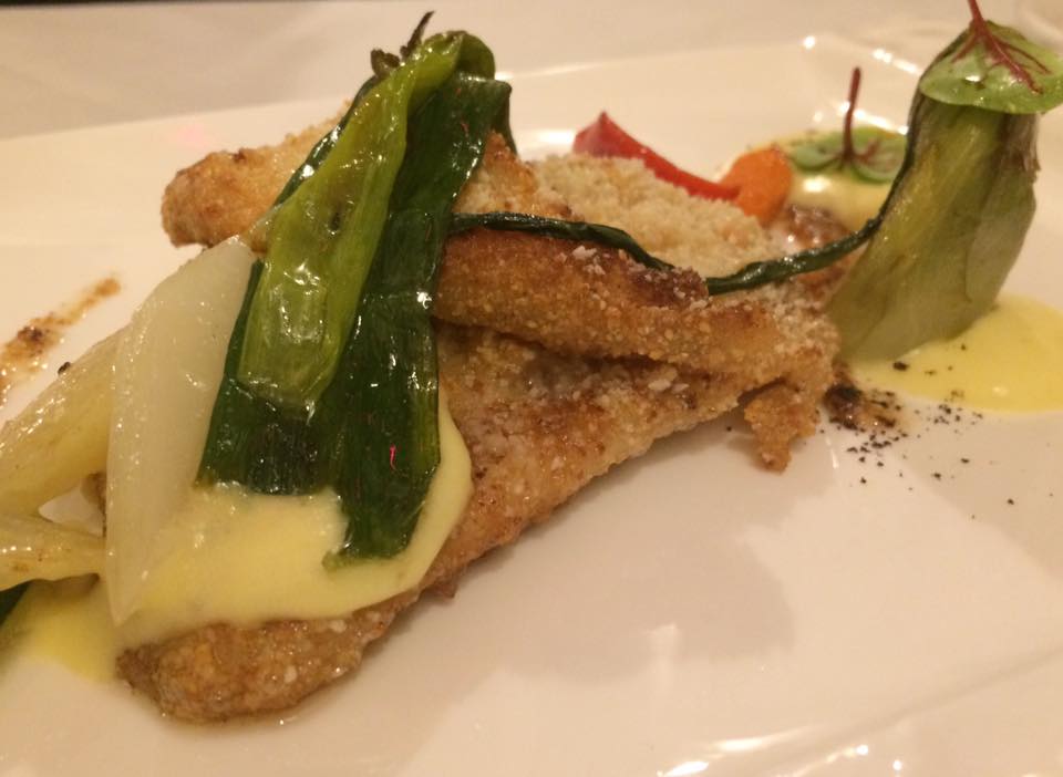 Gradevole e leggero il rombo con panatura alle mandorle tostate con le verdure del mercato: con i loro colori un piacere per gli occhi prima ancora che per il palato.