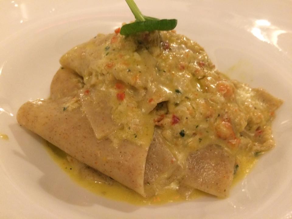 Meno efficace l’altro primo piatto provato: i maltagliati di farro sono troppo delicati, diremmo deboli, per il ragôut di fasolari che invece un formato di pasta secca avrebbe affrontato con il giusto vigore.