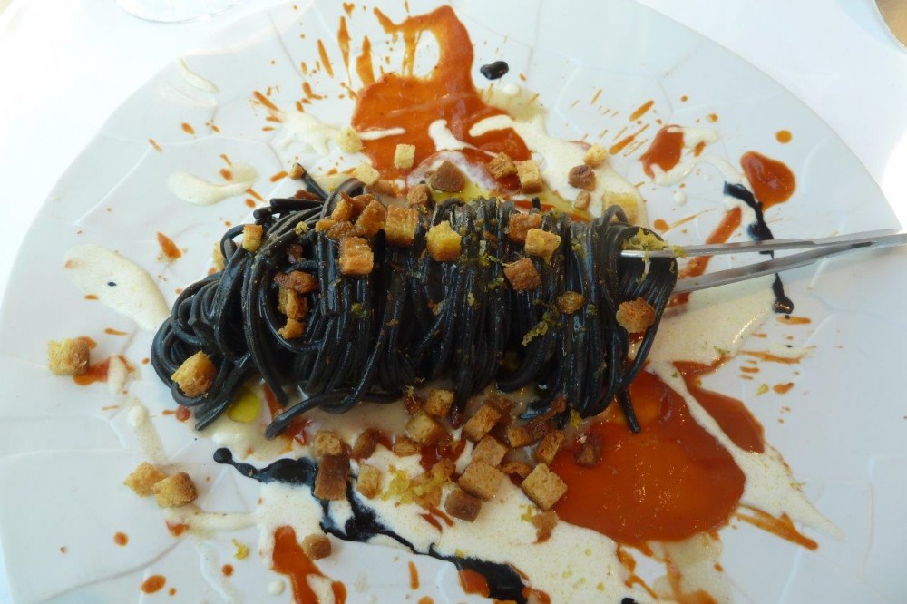 Miramonti l’Altro, Costorio di Concesio, spaghetti al nero, pomodorini del Piennolo e burrata, il piatto viene completato al tavolo con l’aggiunta di olio di menta e olio di limone, porzioni appaganti a dispetto delle due stelle che farebbero presumere solo accenni di godimento