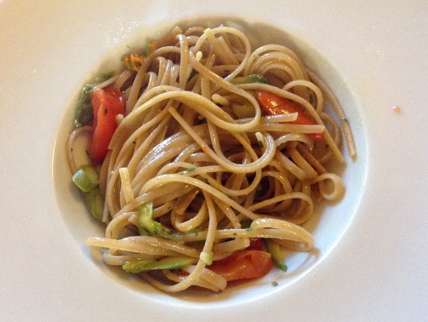 Trattoria Visconti, linguine integrali con asparagi, zucchine e fiori di zucca