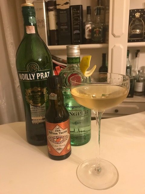 Ovviamente il vermuth rimane dentro al nostro cocktail fino alla fine e non viene buttato, il drink risulta molto più dilatato di un Martini comunemente preparato, aggiungiamo in superficie n°2 gocce di orange bitter senza twist, come riportavano alcune arcaiche versioni del cocktail.