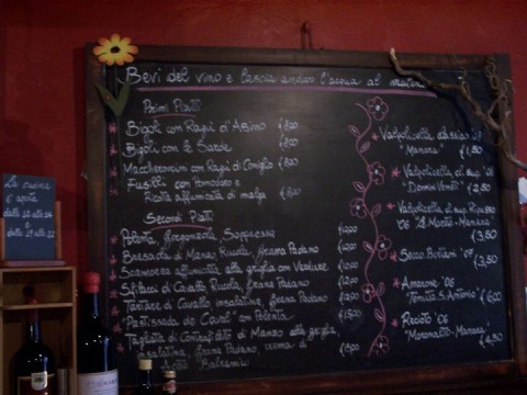 Menu graffito alla lavagna: bigoli al ragù d’asino, bigoli con le sarde, maccheroncini al ragù di coniglio, fusilli con pomodoro e ricotta di malga, pastissada de caval con polenta, sfilacci di cavallo con grana.