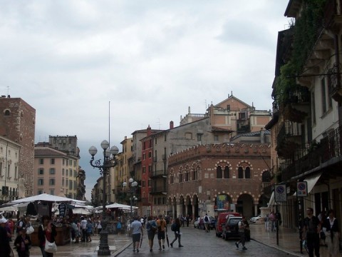 Verona è bella anche così, quando il cielo minaccia tempesta e la folla dei turisti d’estate fa lo struscio per le strade.