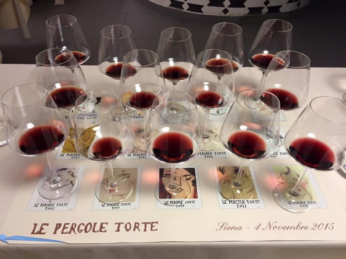 Fu Giulio Gambelli, amico di Sergio, che capì che quei terreni erano adatti ad impiantarci una vigna “fatta come si deve”. Fu così che furono piantati i primi due ettari. Nel 1977, poi, si decise di produrre un sangiovese in purezza in quella più vecchia: nacque così Pergole Torte. Nella presentazione si legge «Oggi la nostra prima vigna ha 47 anni. Quindici anni fa Sergio Manetti ci ha lasciato, come hanno fatto Giulio e Bruno, tre e due anni fa. Noi di Montevertine abbiamo promesso di continuare la loro opera con il loro stile, senza cambiare nulla nel metodo di vinificazione. Fermentazione alcolica e malolattica in vasche di cemento, invecchiamento in barriques Allier di tostatura media nel rimo anno e in botti di rovere di Slavonia nel secondo. Nessuna filtrazione né chiarifica, imbottigliamento per caduta e riposo in bottiglia di almeno tre mesi prima dell’uscita sul mercato». Dall’azienda spiegano poi che quello che è cambiato è l’uva perché è aumentata la produzione ed, ad oggi, la selezione di sangiovese è fatta anche nelle vigne contigui, tutte superiori ai quindici anni. «Ma il cuore della produzione – spiegano – rimane sempre dove tutto è iniziato, nella prima vigna di Montevertine». A condurre la degustazione con spunti notevoli sulla storia dell’azienda ed approfondimenti che hanno dato informazioni importanti per conoscerla ancora di più, Armando Castagno e Giampiero Pulcini. In un dialogo costante con Martino Manetti e gli interventi dell’enologo Paolo Salvi, i presenti hanno potuto toccare con mano la storia di questa realtà vinicola toscana. La verticale è stata curata dall’Enoclub Siena e dal suo presidente Davide Bonucci nel contesto della sala della Contrada della Lupa nel centro della cittadina toscana.
