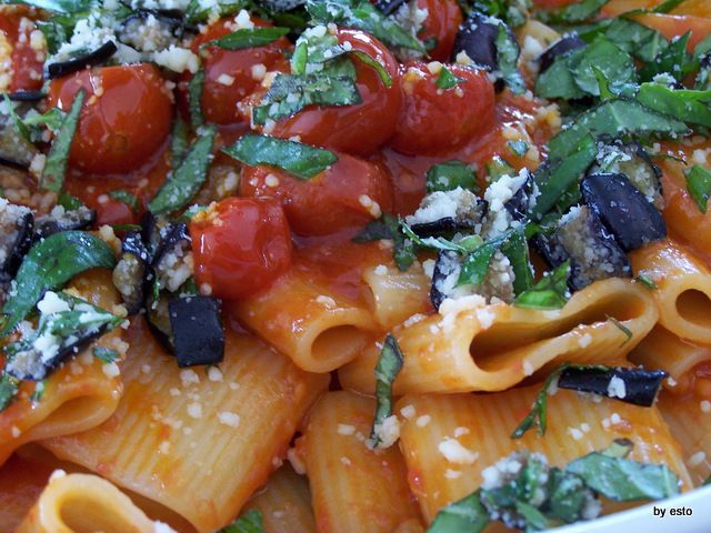 I mezzi paccheri rigati con melanzane e pomodorini del piennolo del Vesuvio.