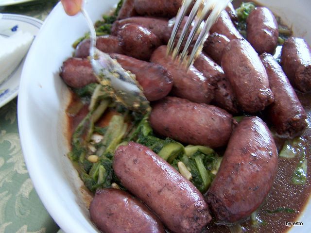 La salsiccia di maiale tagliata a punta di coltello e tirata nel Forgiato. In compagnia delle scarole ricce stufate. Buona.