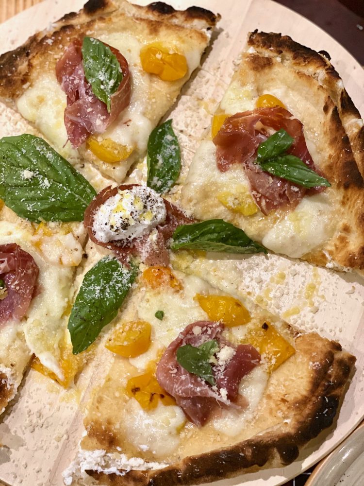 L’impasto che propone è un mix di tradizione e contemporaneità, ben bilanciate nel disco leggero e digeribile, con il cornicione evidente, che si presenta equilibrato anche nei topping. Una pizza “napoletana” che mostra modernità, intuibile al primo morso, dove è anche evidente la scelta attenta di alcuni prodotti che impreziosiscono la pizza, come il pomodoro e il fior di latte, per esempio.