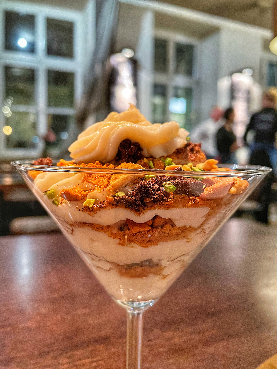 Terza ed ultima portata è il dessert, preparato al momento dal maître di sala: un cannolo scomposto con ricotta di bufala, scaglie di cioccolato di Modica, granella di pistacchio di Bronte e crumble al tartufo bianco. La dolcezza della ricotta e le note inconfondibili del tartufo bianco rendono questo dolce speciale e al contempo unico nel suo genere.