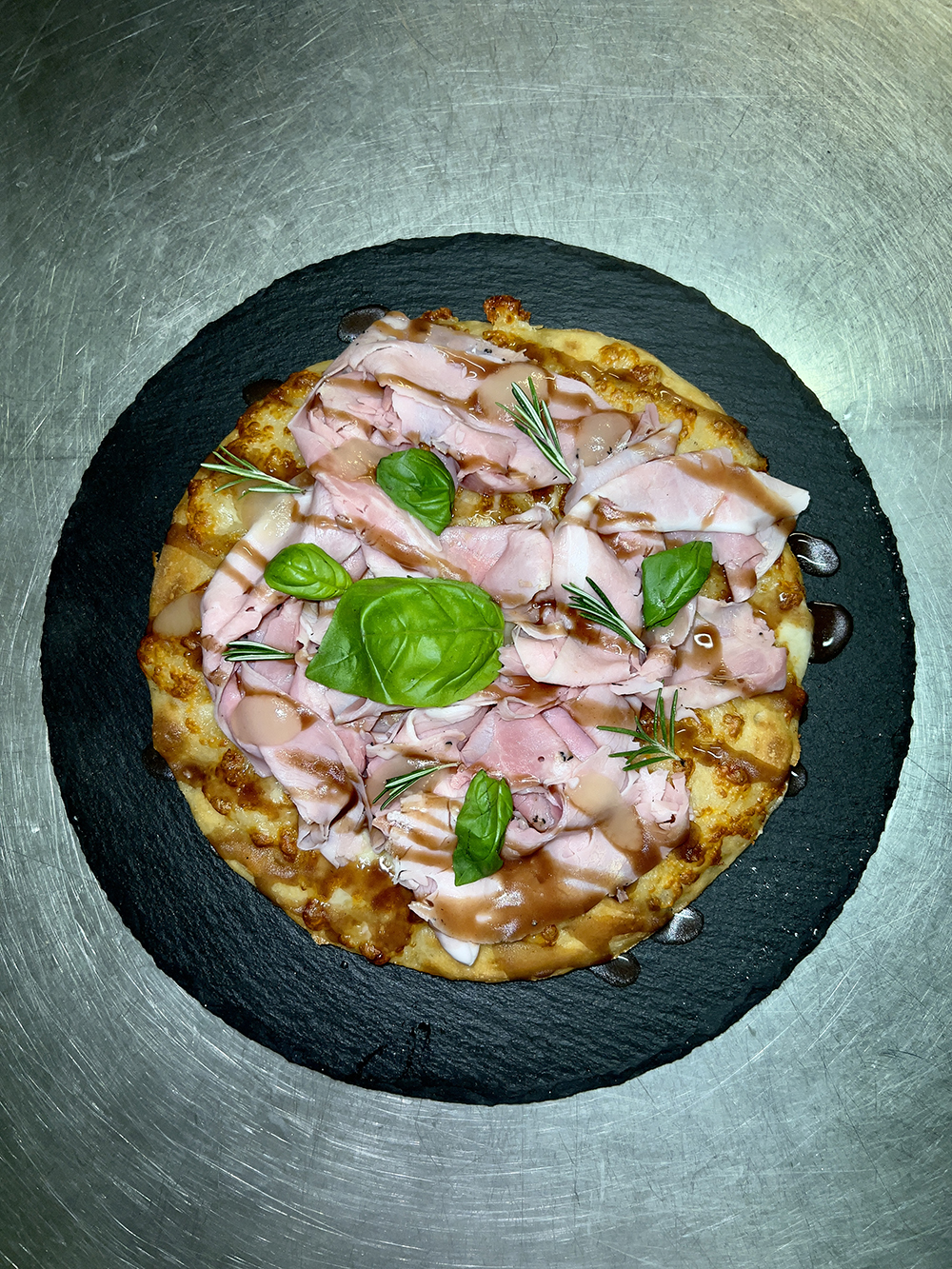 Sulla base della pizza aggiungere il fiordilatte, il prosciutto cotto tartufato, il fondo ai funghi porcini e la composta alle pere. Concludere con erbe aromatiche, basilico e olio extravergine di oliva. Infornare a 260 °C per 5 minuti. Servire.