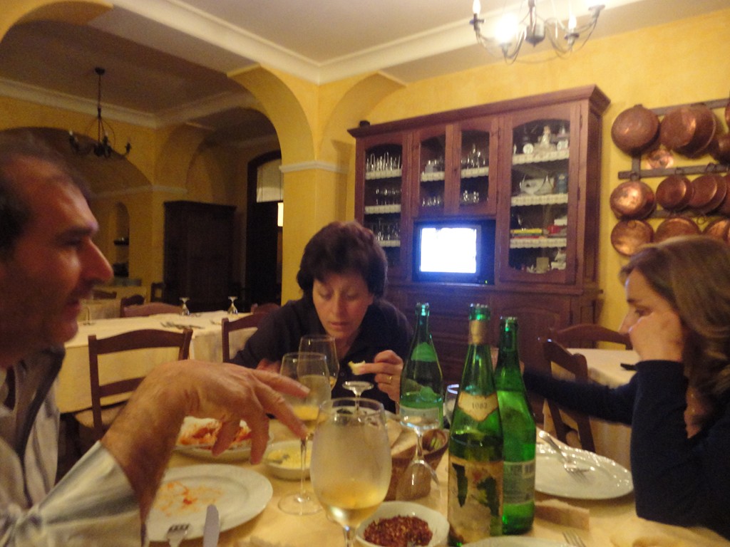 Lo verso dalla classica bottiglia renana d’antan, mi appare con un colore giallo dorato carico, tendente all’ambrato. Classica roteata nel bicchiere, mi esce abbastanza consistente(vol. alcolometrico 12%). Al naso è “strano”, a parte l’evidente ossido-maderizzazione del vino, noto un altro sentore non molto piacevole che molto francamente non riusciamo a descrivere, nè io, nè Rita…Ciro non ci degna di attenzione, tutto preso com’è dai cardilli, sui quali ha riversato una generosa dose di peperoncino. Ad ogni buon conto, i circa trent’anni di questo vino, anche a suo giudizio, si sentono tutti, e di comune accordo con gli altri commensali, decidiamo di fermarci qui.