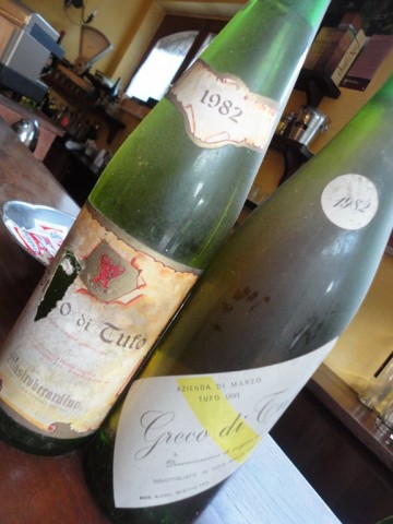 Mi arrovello il cervello per abbinare i vini (mamma che stanchezza!) e spulciando nel “mio caveau”, mi balena in testa un’idea : devo costringere, per una sorta di contrappasso, Ciro Picariello, fianista per eccellenza, a bere il greco, e non un greco dei nostri tempi, ma i classici degli anni ottanta, Di Marzo e Mastroberardino, ambedue annata 1982 (a vista, sotto la polvere, mi sembrano le più in forma). Si inizia con i cardilli saltati all’aringa affumicata ed è lì che “ci piazzo” i due greco.