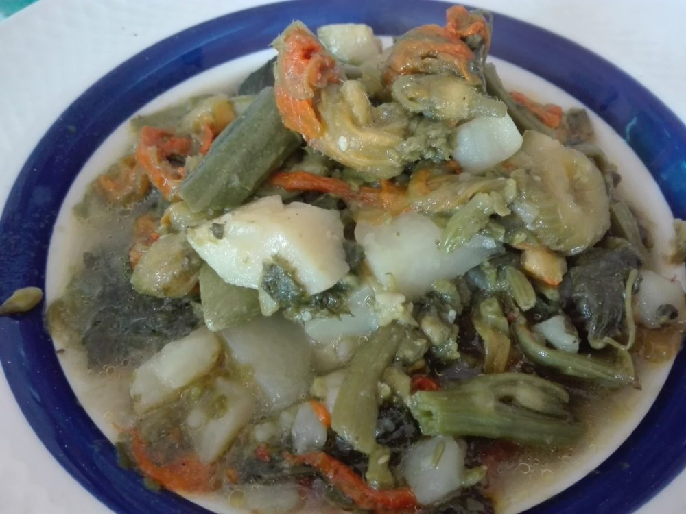“ Molto spesso si preparava e si cucinava direttamente nell’orto dove si avevano a disposizione tutti gli ingredienti necessari: melanzane, peperoni, patate, cipolle, basilico se si preparava stufata nel tegame altrimenti se si friggeva, erano sufficienti solo melanzane, peperoni, patate, sale e olio. Bastava poco e naturalmente era fondamentale la ‘sartania’, la classica padella in ferro, annerita completamente dall’uso prolungato sul fuoco.