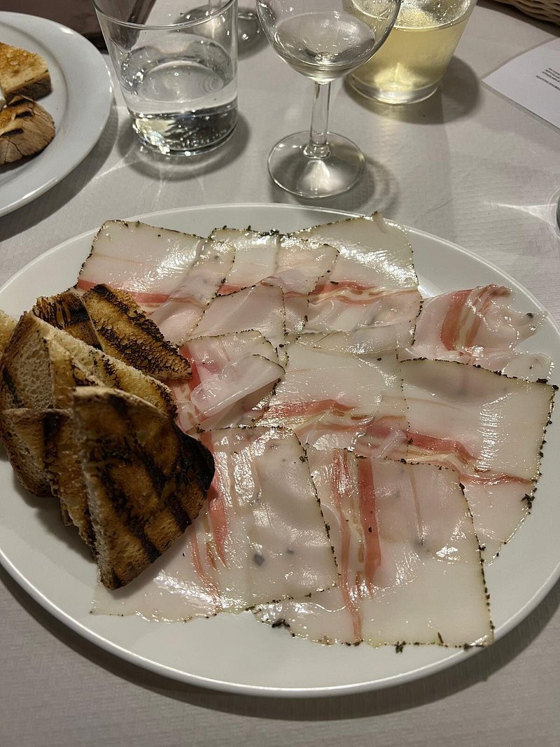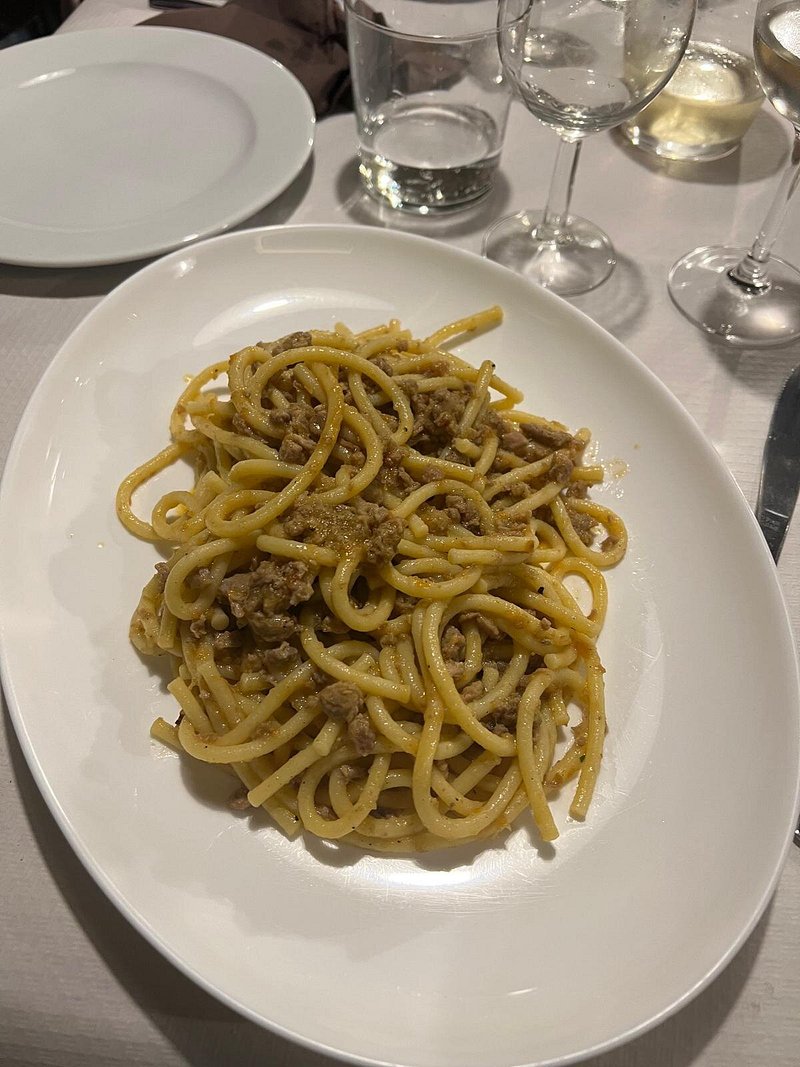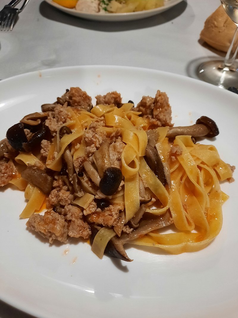 I maccheroncini al ragù di salsiccia evidenziano una cucina di sostanza, con una componente grassa ben integrata nella pasta, mentre i tagliolini al tartufo nero puntano sull’aromaticità, lasciando spazio alla fragranza del fungo.