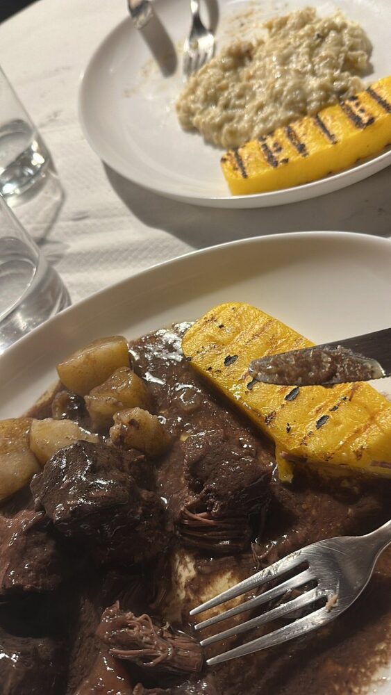 Tra le proposte di mare, gli spaghetti alla bottarga e i tagliolini al salmone mantengono una linea classica, centrata sulla pulizia del gusto. Il fulcro della carta resta il Baccalà alla vicentina, eseguito secondo la ricetta codificata: stoccafisso ammollato con pazienza, lenta cottura con cipolla, latte e olio, risultato cremoso ma strutturato, servito con polenta.