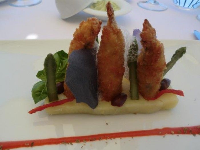 Angiolieri, pollo ruspante baby con crema pasticciera salata e fritta, cipolla di Tropea cotta al sle e jus al miele