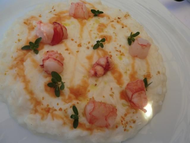 Angiolieri, risotto carnaroli mantecato al latte di bufala, agrumi, gambero rosso, vaniglia e salsa di crostacei