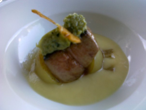 In questo antipasto l’acidità è chiesta alla pesca nettarina, biodiversità dei Monti Lattari in un tripudio dolce di consistenze con il debole richiamo alla serietà, inascoltato, da parte del pesto. Un modo per risolvere la banalità del foie gras, anche con chi, come me, ne è ghiotto.