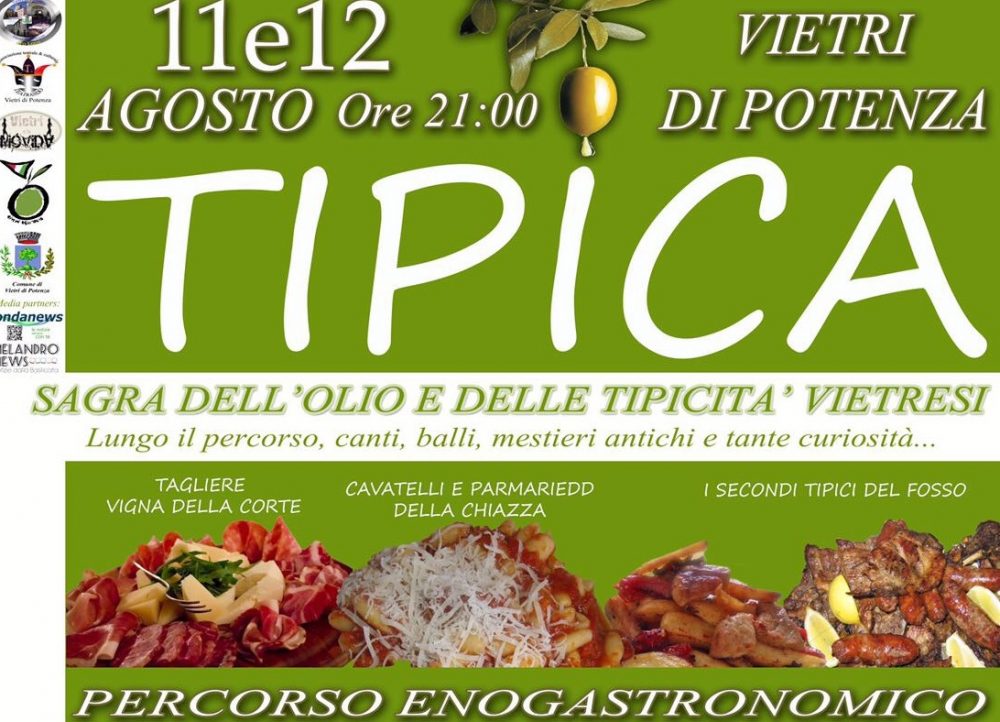 Odori, sapori, gastronomia, prodotti tipici, musica, divertimento, organettisti, antichi mestieri, artigianato e tante curiosità. In un solo evento, “Tipica”, la cui quinta edizione è in programma l’11 e 12 agosto a Vietri di Potenza. La sagra dell’olio e delle tipicità vietresi e lucane è pronta anche quest’anno a stupire i visitatori, che ogni anno accorrono in migliaia nei vicoli del centro storico vietrese. Un percorso unico nel suo genere, variegato e dislocato in tre aree principali collegate tra loro dai vicoletti stretti e caratteristici del centro storico. Niente euro nel percorso, la moneta utilizzata sarà il ducato vietrese, coniata appositamente e disponibile presso il “Banco di Vietri”, postazioni di cambio disponibili in più punti del percorso. Tra una sfida a morra e un assaggio del vino rosso, si potranno degustare ottimi piatti come orecchiette lucane e cannolo con ricotta, fiori di zucca, salsiccia, porchetta, grigliate miste, degustazioni con olio vietrese e pomodorino, caciocavallo arrostito e latticini freschi, antipasti, arrosticini di castrato e maiale, ciambotta, pane arabo, zeppole frette e tanti altri piatti tipici e sfizioserie.