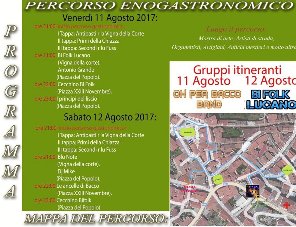 Anche quest’anno l’iniziativa è organizzata in sinergia dalle associazioni Pro Loco, Teatrando, Vietri & La Movida e Città dell’Olio, con il patrocinio del Comune. Ma è una manifestazione, l’unica vietrese, che chiama a raccolta tutta la comunità che freme e ha già iniziato il suo countdown per la due giorni tanto attesa. Nelle tre aree principali del percorso (Vigna della Corte, Chiazza e Fuoss) non mancheranno musica e intrattenimento con Bi Folk Lucano, Antonio Grande, Cecchino Bi Folk, I principi del Liscio, il gruppo itinerante Oh per bacco band, Blu Note, Dj Mike e Le ancelle di Bacco.