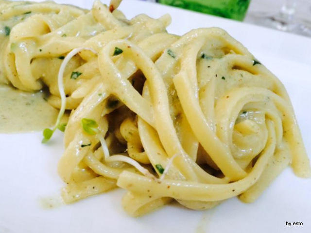 La linguina al pesto vietrese. La bella invenzione, fatta chissà da chi, della crema di noci e olio della costa d’Amalfi con i sentori di basilico.