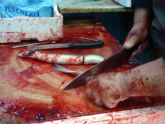 Divisi in due vasche – di qua i più piccoli (16 euro al chilo) e, di là, i più grandi (18 euro al chilo) – nelle quali si riversa di continuo acqua fresca e gelata, i capitoni, scivolando l’uno sull’altro e boccheggiando come in cerca di conforto reciproco, attendono il proprio destino: un coltellaccio o una mannaia.