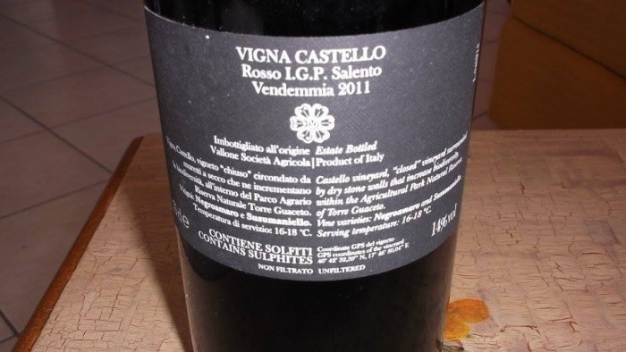 Una di queste è il Vigna Castello Rosso Salento Igt, di cui ho degustato in questi giorni il millesimo 2011. Blend composto da negroamaro al 70% e saldo di susumaniello. La fermentazione e la maturazione di questo vino è avvenuta in serbatoi di acciaio, in tonneaux, in barriques, in vasche di cemento ed in vetro. Il tasso alcolometrico raggiunge i quattordici gradi.