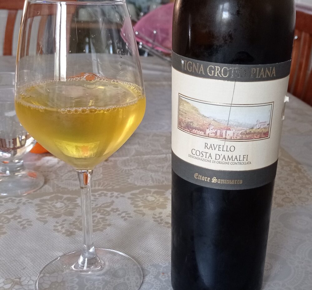 Più di una volta ho avuto l’occasione di degustare i vini aziendali e li ho sempre trovati straordinari. In questi giorni ho scoperto nella mia cantina un bianco che mi ha sempre affascinato e di cui ho riassaggiato lo stesso millesimo a distanza di quasi sei anni dall’ultimo mio report: Vigna Grotta Piana Ravello Bianco Costa d’Amalfi Doc 2017. Blend di Ginestrella, Falanghina e Biancolella. Fermentazione in acciaio, maturazione per metà in barriques di rovere francese e metà in acciaio e poi elevazione in bottiglia. Vino raro prodotto soltanto in annate particolarmente favorevoli, tanto è vero che di questo millesimo sono state confezionate appena 1.900 bottiglie. Gradazione alcolica di tredici e mezzo. Prezzo attuale intorno ai 35,00 euro.