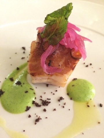 Sobrietà e sicurezza firmano piatti d’autore come il Polipo scottato con crema di zucchina in scapece e cipolla marinata; o lo Sgombro marinato, con carota di Polignano, zenzero e puntarelle, un piatto di ricerca che dimostra la voglia dello chef di utilizzare solo prodotti dei mercati vicini.