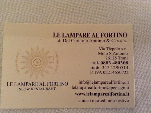 Palcoscenico di questa piacevole degustazione è stato il ristorante Le lampare al Fortino, un balcone sul porto di Trani, una location unica, collocato in una chiesa sconsacrata che ha inglobato un vecchio fortino fortificato, struttura completamente in pietra viva. Il cambio ai fornelli ha giovato soprattutto nell’alleggerimento dello stile, con padronanza delle tecniche al fine di non stravolgere il prodotto.