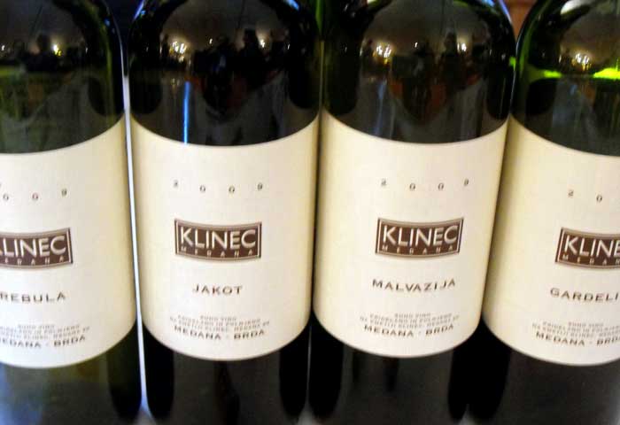 Nonostante le opportune “espulsioni”, i vini degustati cominciano a richiedere sostanze più solide, richieste del corpo e dello spirito avvalorate dall’ora che ha abbondantemente superato quella di pranzo. Decidiamo però di proseguire e puntare la barra a dritta, verso Medana, Slovenia, nel Collio Friulano per incontrare KLINEC ed i suoi quattro meravigliosi e complessi bianchi del 2009: 1) Rebula, l’autoctona ribolla gialla, fermentazione spontanea con lieviti autoctoni, due anni sulle fecce in botti di acacia, la cui complessità al naso ed in bocca è facilmente immaginabile; 2) Jakot, tocai friulano, delicato e con profumi selvatici. Il Tocai ha un deciso sapore di mandorla, è ben ricavato, intenso ed equilibrato. 3) Malvazija, malvasia Istriana con note aromatiche di moscato, due anni sulle fecce in botti di acacia. Equilibratissimo tra delicatezza e forza. Ottimo!; 4) Gardeli, pinot grigio che resta a lungo a contatto con le bucce.