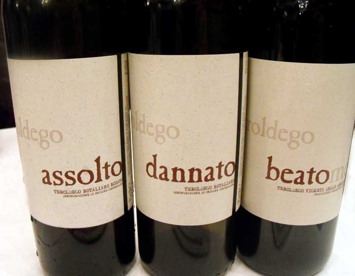 A Mezzolombardo c’è REDONDÈL, “piccola azienda agricola” che racconta storie di vino da generazioni: «faccio vino perché a nove anni mio padre mi svegliava all’alba per accompagnarlo nelle vigne». Assolto 2011 teroldego in versione “rosa”, Dannato 2009 campione di vasca (il 2008 è finito prima della fine dell’evento) teroldego rosso lungamente affinato anche in castagno, legno notoriamente più economico per la tradizione contadina, Beatome teroldego da vigna vecchia di 80 anni a 150 metri sul livello del mare, fermentato ed affinato in legno, questa volta la scelta cade solo sul più “ricco” rovere.