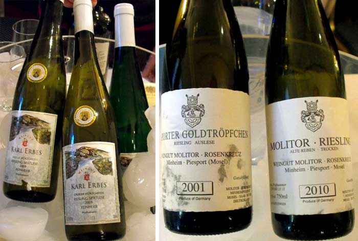 Inconfondibili le bottiglie di Riesling con i loro meravigliosi verdi e sfumature color “petrolio” come i sentori di idrocarburi che il vitigno riesce ad esprimere dopo la sua fase dormiente; le etichette sembrano “sirene” che attirano con il loro “canto” i degustatori con i caratteri ed i colori gentili ma allo stesso tempo decisi e riconoscibili. E’ la tedesca Mosella che sa regalare emozioni allo stato liquido con le sue anse tra le quali sono incastonati i meravigliosi vigneti, a volte a picco verso il fiume. I vini delle WEINGUT KARL ERBES e WEINGUT MOLITOR-ROSENKREUZ non hanno tradito le aspettative regalando tutta la gamma di profumi che questo vitigno sa esprimere, la freschezza di acidità ma anche le morbidezze assecondate dal residuo zuccherino che, variando, caratterizza la tipologia: spatlese, qualitatswein dry, auslese; l’annata 2001, manco a dirlo, ci attira per la svolta sensoriale verso il “risveglio” dopo il “letargo” delle fasi fruttate e floreali.