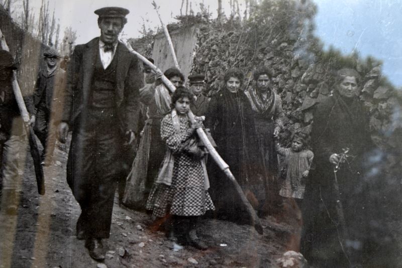 La popolazione di Terzigno abbandona le proprie case durante l’eruzione del 1944 e porta con sè i pali di castagno per la vigna