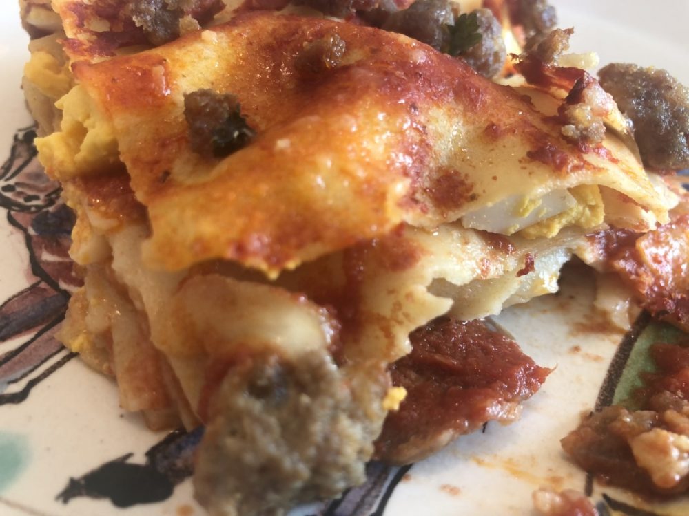La lasagna tradizionale è bella ricca, con uovo sodo, polpettine e salsiccia secca e sarebbe stata perfetta se la sfoglia superiore fosse stata più croccante, quasi biscottata, come piace a me.