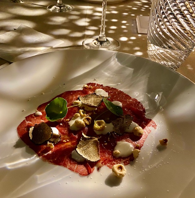 Il “Carpaccio di manzo, mozzarella di bufala e tartufo nero” esegue alla perfezione il proprio compito di accompagnare ed esaltare lo Chardonnay Collezione Privata 2019 di Isole e Olena: sottilmente esotico e speziato, dal sorso pieno, rotondo e avvolgente.