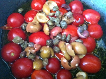 Ah, intanto aggiungete anche le olive verdi così restano sodette fino alla fine.
