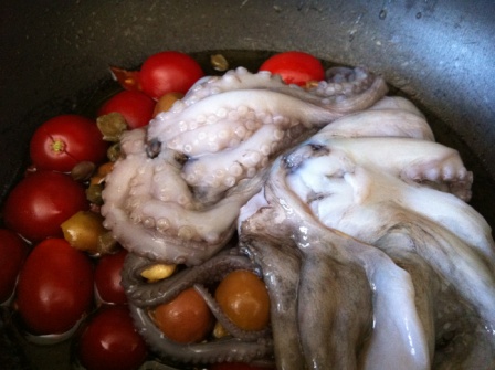 Lasciare cuocere fino a che il polpo cambi colore e ancora un po’.