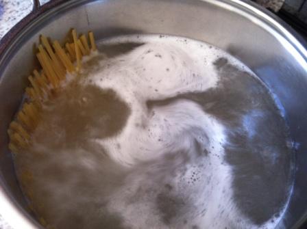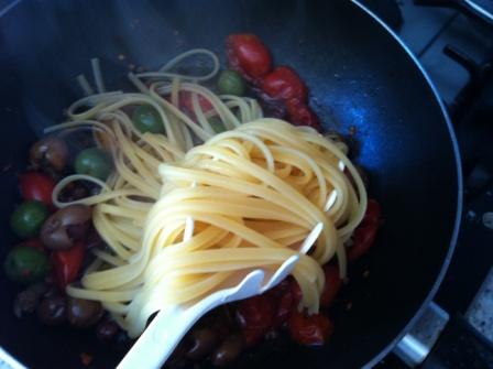 Scolare le linguine al dente e unire all’intingolo da cui si sono allontanati i polpi.