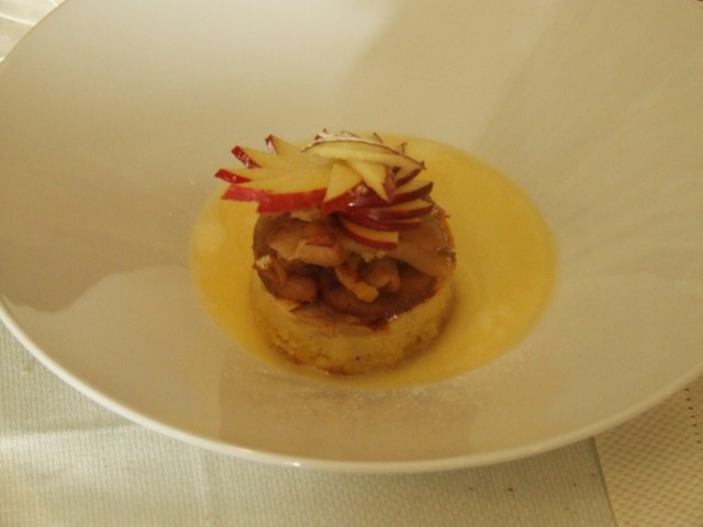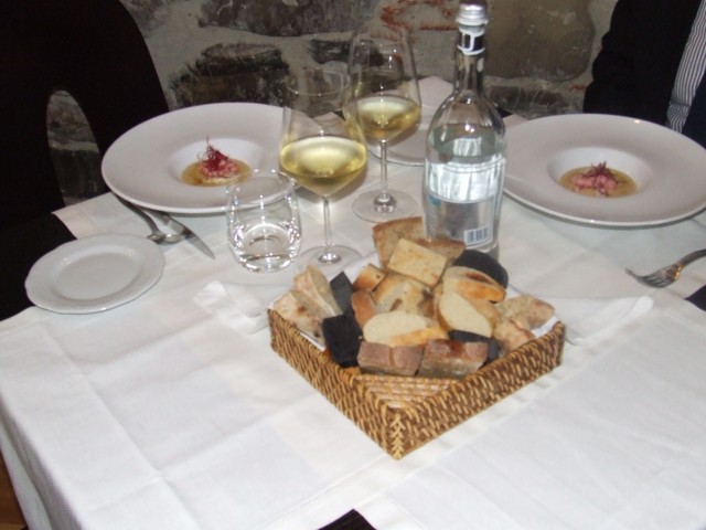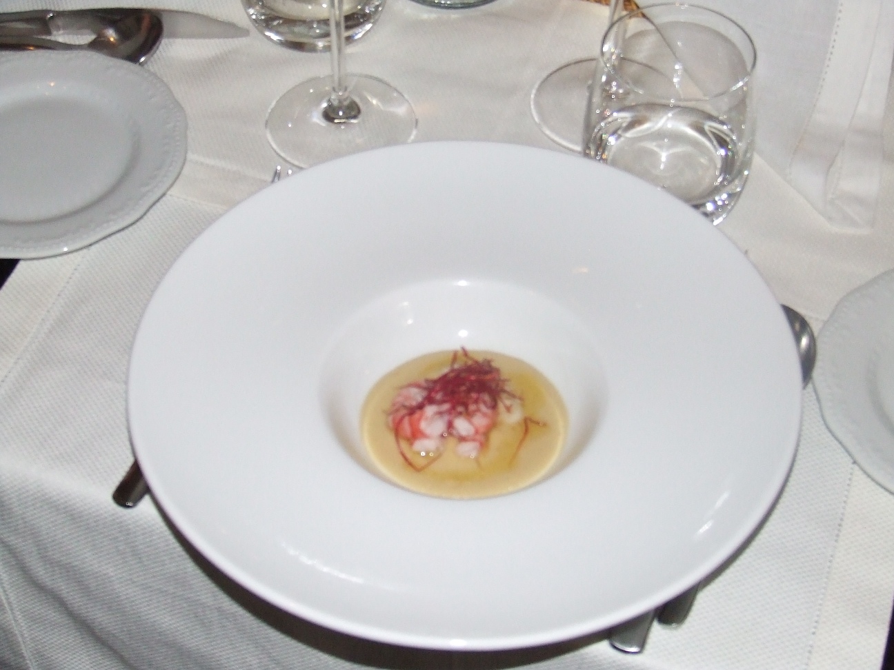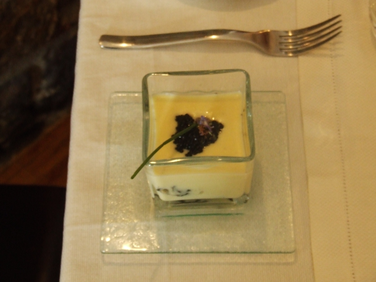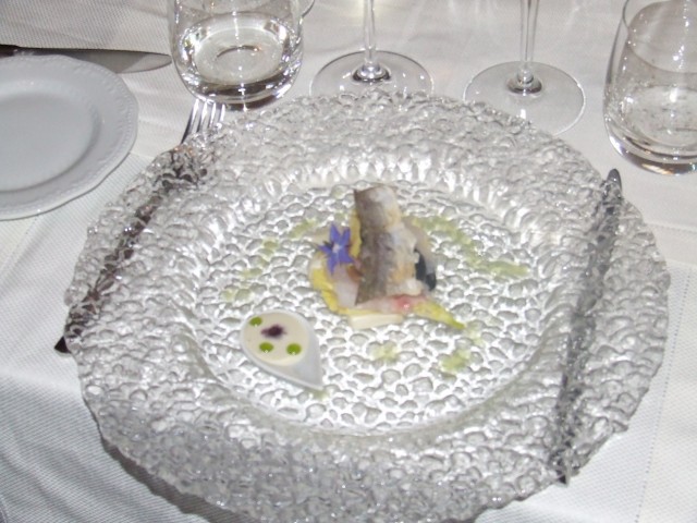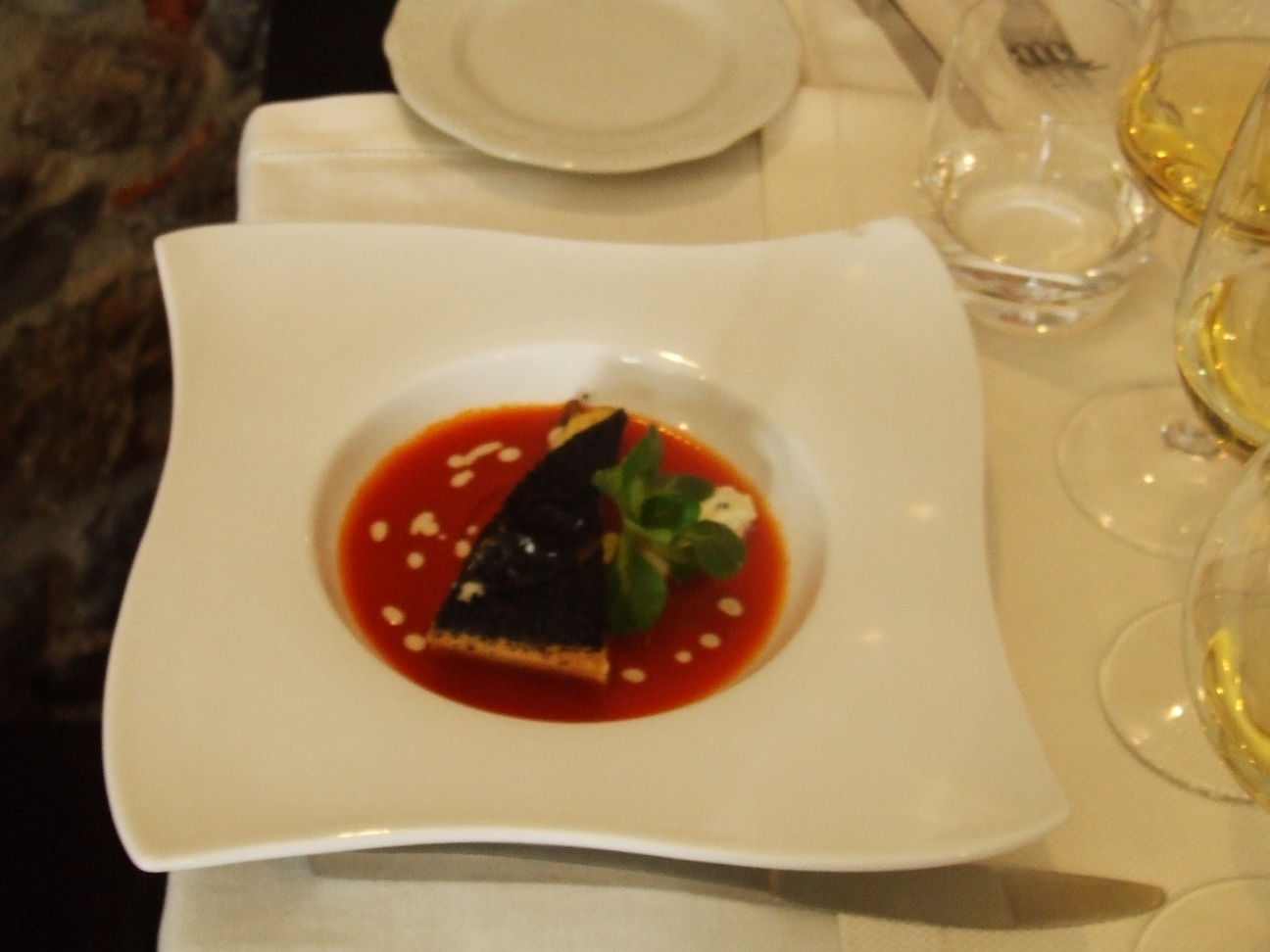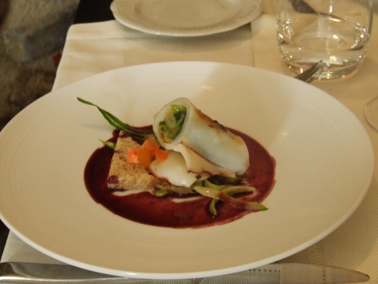 Il secondo antipasto è il Cappuccino di mare: seppie al nero con spuma di patate di cava calcarea e caviale di Mujol. Se c’è un cavallo di battaglia per questo chef l’abbiamo trovato proprio in questo piatto, dove la sua geniale fantasia sa esprimersi ad alti livelli. Un riuscito esercizio di equilibrio, che sfocia in una goduria per il palato. Però, adesso che ci penso, ne avevo già sentito parlare altrove, se non sbaglio. Mah!